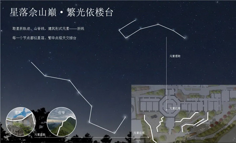 星落佘山巔·繁光依樓臺——取星辰軌跡、山脊線(建筑形式的折線元素),將似星落的每一個節(jié)點串聯(lián),點綴天文樓臺,營建佘山繁華。