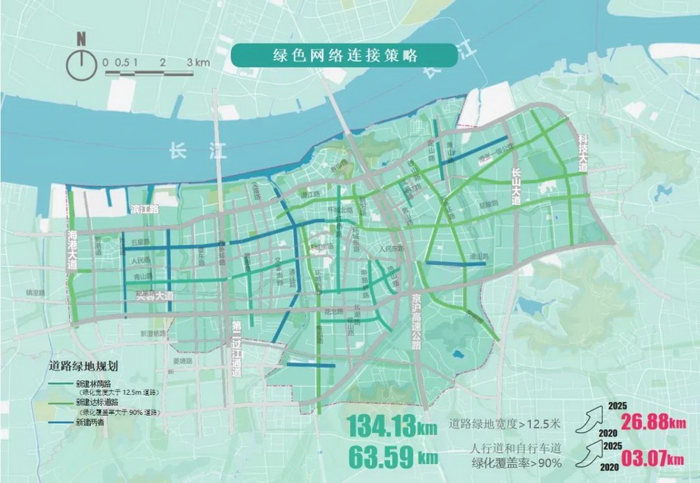 依托公園、道路與水系綠地的挖潛,新增公園綠地面積600hm2+,新增綠道178.15km、綠道長度達到203.80km,新創(chuàng)建綠地寬度在40~50m的生態(tài)達標道路17.53km;新創(chuàng)建3.07km林蔭路,林蔭路推廣率大于85%。