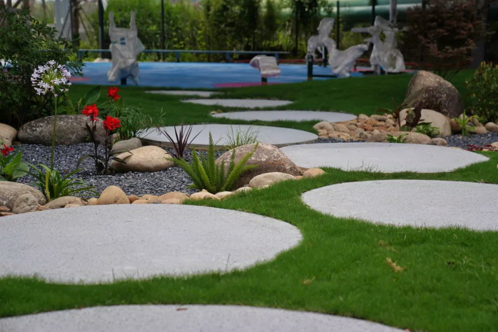 金屬網(wǎng)格柵彩繪森林圖案、地面明亮的黃色鋪裝一氣呵成、弧形汀步生動(dòng)有趣,鮮活跳躍,猶如夏日中的螢火蟲(chóng)圍繞場(chǎng)地飛舞。