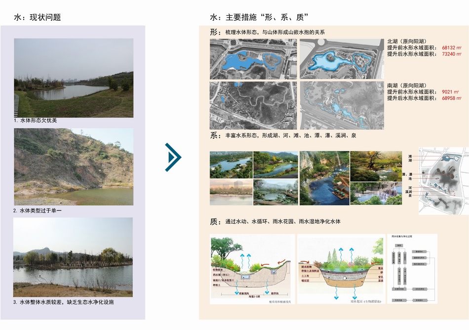 水——以水之靈動(dòng)為主線,形成“水繞燕山,綠映水中”的山水城市景觀。針對(duì)于現(xiàn)狀問題,設(shè)計(jì)對(duì)水的“形、系、質(zhì)”進(jìn)行提升。