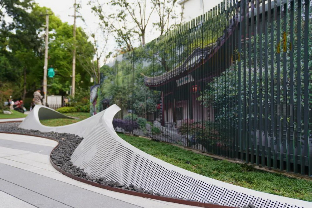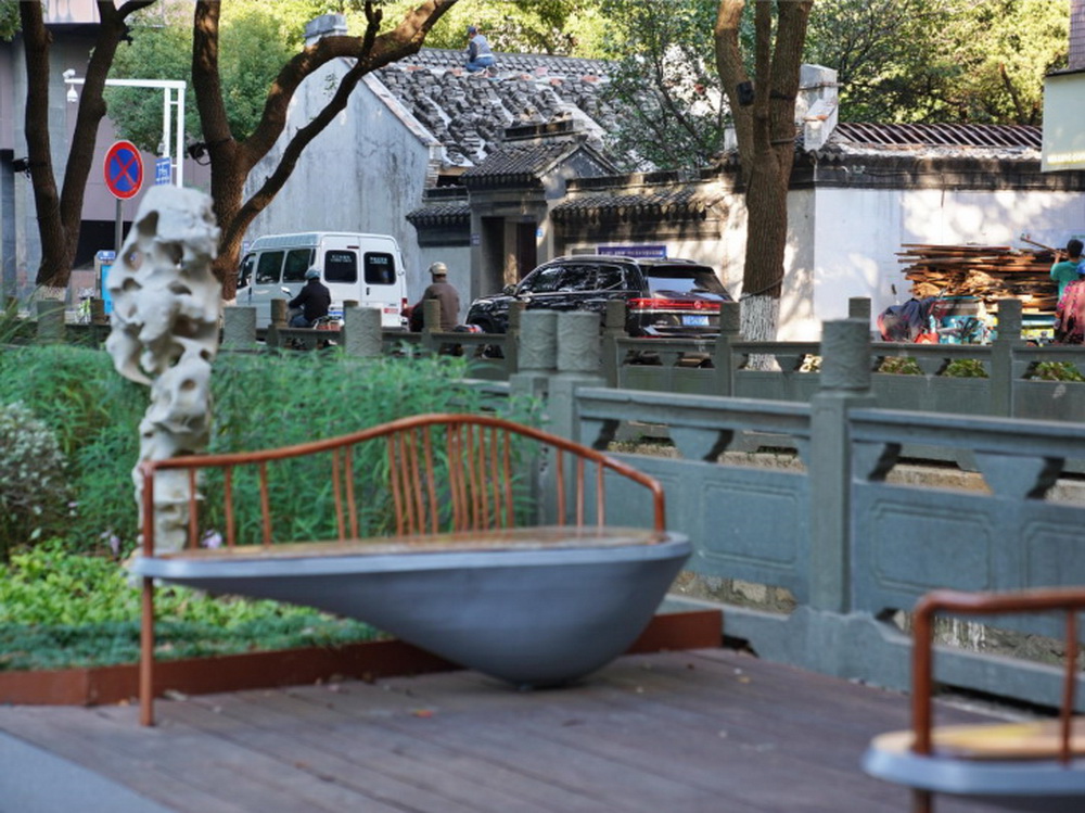 隱園緊鄰后街河,承繼昆山名人“電腦大王”王安的舊居“隱廬”之名,采用藏、引結(jié)合的空間組織手法,將街角閑置地營(yíng)造為集游憩與人文展示于一體的復(fù)合空間。本次改造中,沿河梳理苗木,在隱園入口臨河側(cè)增加休憩場(chǎng)地,融入帶有明式家具風(fēng)格的藝術(shù)座椅,優(yōu)化沿河步行走廊休憩功能性。