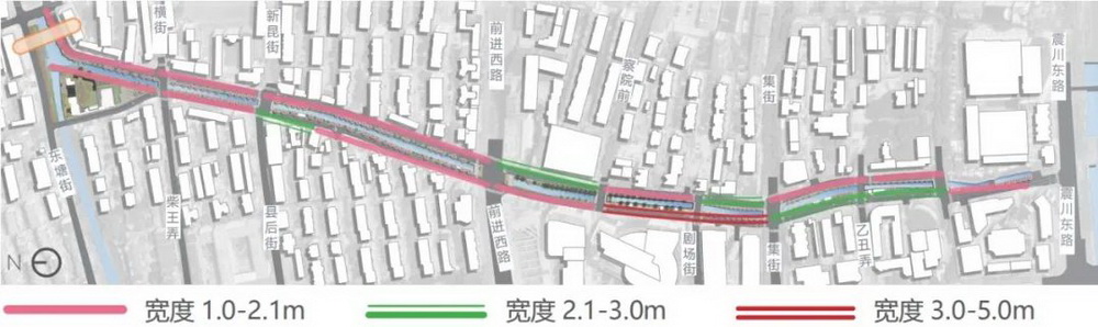 該區(qū)段以昆山首條地鐵11號(hào)線所在道路前進(jìn)西路為中心,包含南北各一個(gè)街區(qū),其中前進(jìn)西路以北為北后街及北后街下塘,南側(cè)為南后街及南后街下塘,河道寬度4.5-8m,水岸綠化寬度,西岸3-5m,東岸2-3m,水岸落差1.6m。