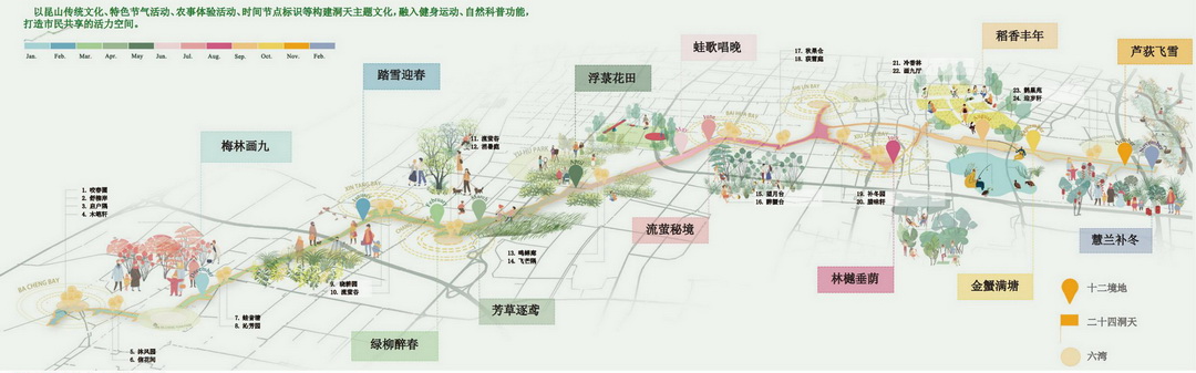 形成“一廊、六灣、十二境地、二十四洞天”的規(guī)劃格局,以昆山傳統(tǒng)文化、特色節(jié)氣活動(dòng)、農(nóng)事體驗(yàn)活動(dòng)、時(shí)間節(jié)點(diǎn)標(biāo)識(shí)等構(gòu)建洞天主題文化,融入健身運(yùn)動(dòng)、自然科普功能,打造市民共享的活力空間。