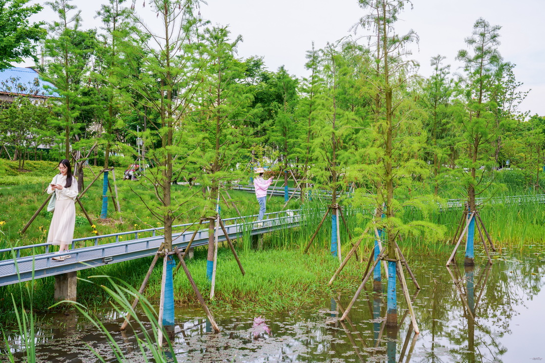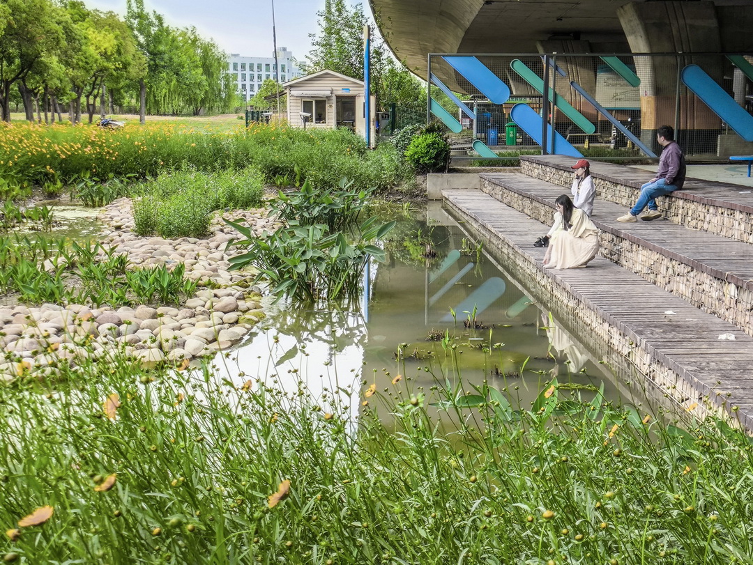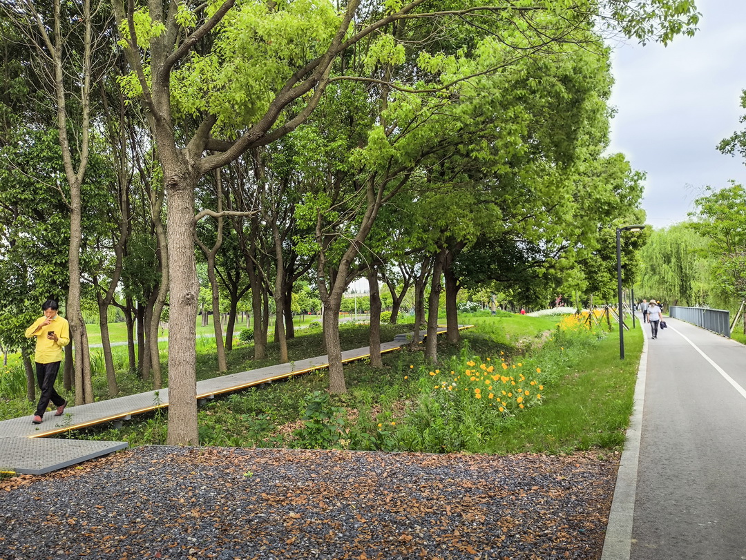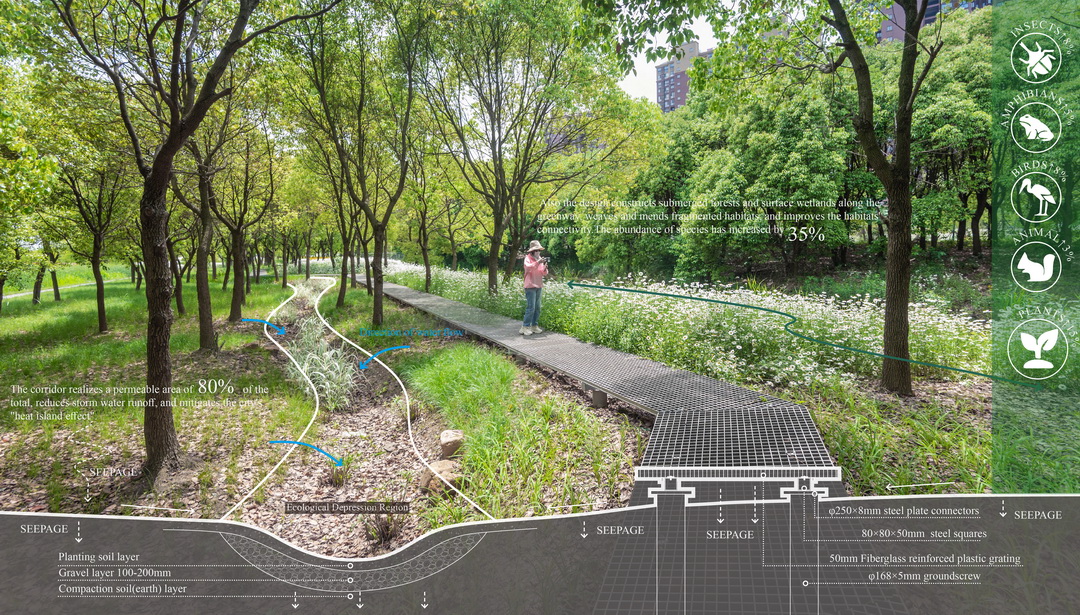 利用原有水體、洼地、排水溝等構(gòu)建河岸兩側(cè)的緩沖帶,對地表徑流進(jìn)行截留和納污,廊道北段全線實(shí)現(xiàn)了85%可滲水區(qū)域,減少暴雨徑流,改善了城市的“熱島效應(yīng)”;沿綠道沿線構(gòu)建水下森林與表流濕地,織補(bǔ)破碎化生境,提高棲息地連通性。