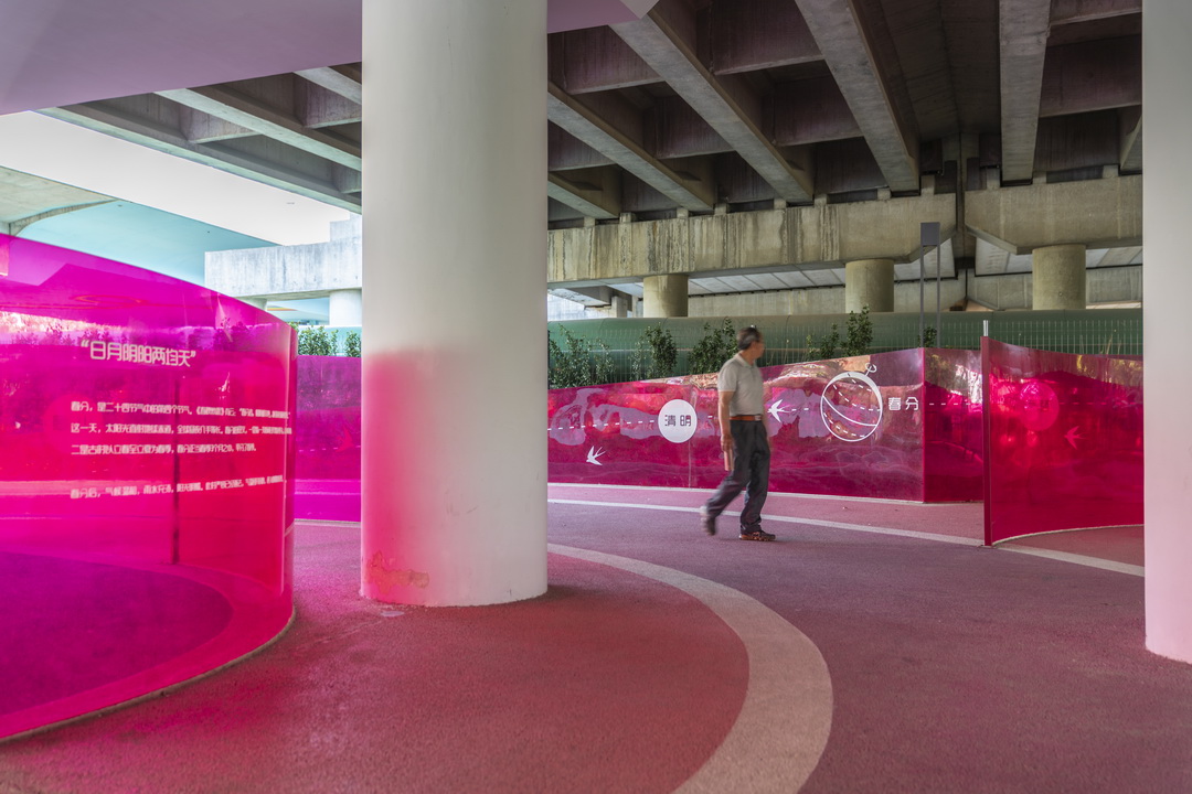 設(shè)計(jì)以中國古人“讓自然做功”的生存理念和遵循自然節(jié)氣規(guī)律的農(nóng)耕智慧為敘事主題,將“四季十二個(gè)月份、二十四節(jié)氣”的自然演替規(guī)律融入沿線12個(gè)區(qū)段和24個(gè)高架橋下“剩余空間”的再生設(shè)計(jì),形成“十二境地”“二十四洞天”的景觀格局,營造探索時(shí)空交感的體驗(yàn)空間。