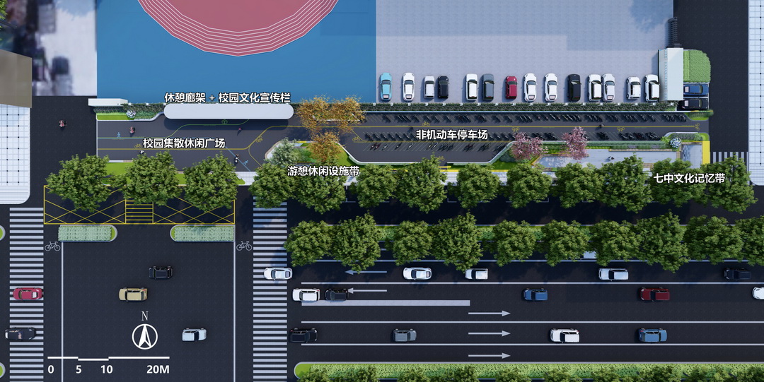 通過(guò)深入調(diào)研分析,七中師生有很較大的非機(jī)動(dòng)車(chē)停車(chē)需求、上下學(xué)瞬時(shí)大流量的集散需求以及家長(zhǎng)接送的等候休憩需求。設(shè)計(jì)尊重師生家長(zhǎng)的使用習(xí)慣,思考在這樣百米長(zhǎng)的線(xiàn)性空間內(nèi),如何合理高效解決停車(chē)、導(dǎo)入游憩與美化界面問(wèn)題。