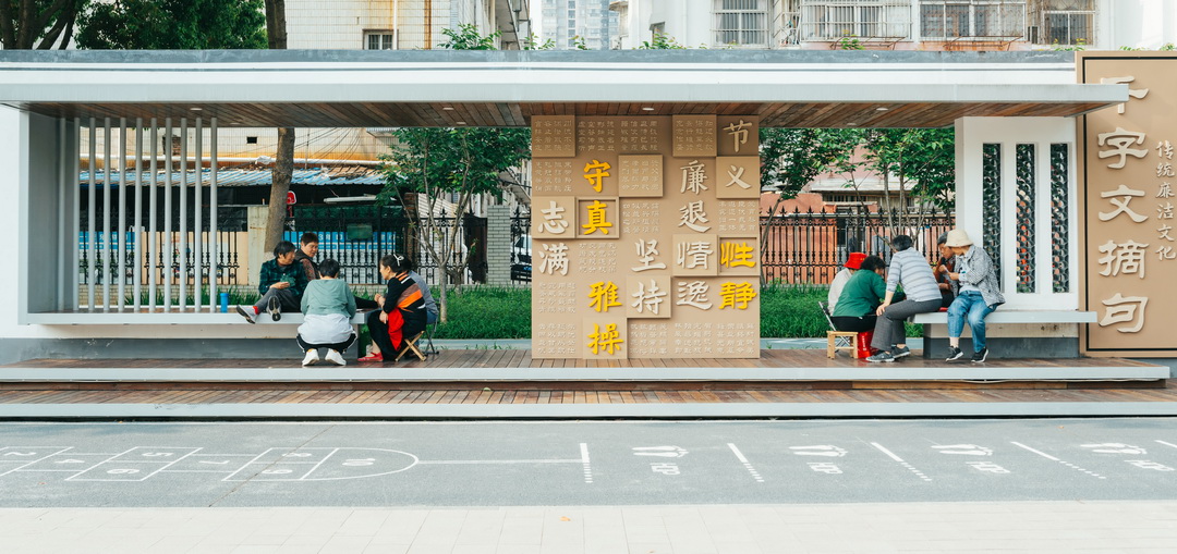設計以“千字文”為主題,運用在廣場鋪裝和休憩亭廊設計中,既以雅致簡約的風格裝點了空間,又起到科普教育的作用,使該空間充滿人文氣息。